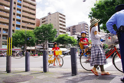 等待的過程看到許多有趣的人,包括騎著菜籃車的日本媽媽,和她車上掛著的小孩(竟然還戴安全帽!台灣人該多學學!),穿著浴衣的少女們嬌滴滴的趕路,有些年紀大些的會穿和服,之有氣質的,看著人家我都覺得我是個粗魯的傻妞了我。工程局派人來將路口的紅綠燈拆了換個方向,免的卡到鉾車的車頂,消防人員也帶著水桶在一邊待命,群眾也都被勸退到封鎖範圍之外,一切就緒囉。