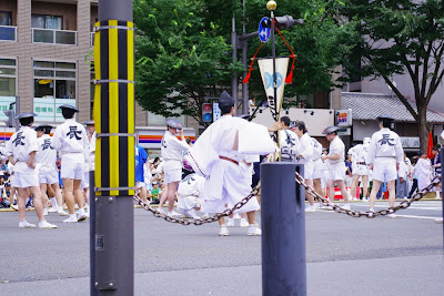 回到山鉾巡行。鉾車要轉彎不是一件容易的事情,因為它並不是一台真的有輪子的車,而是由無數壯丁拖拉的老古董轎子,上頭還坐了二三十個吹拉絲竹的大人(我們在京都的七天,走到哪都會聽到店家在放山鉾巡行長刀鉾的歌,我都戲稱晚上作夢都會聽到啦!)。