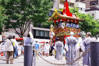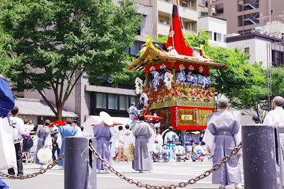 鉾車要轉彎前,神明要先下車。兩位小神明可以踩到地,因此自行走下鉾車。中間的大神明不可以踩到地,所以由一位壯丁背他下來。壯丁還表演了一招「空中背神明轉彎」,圍觀群眾包括我們都忍不住鼓掌叫好。我忽然想起我阿母說日本人很妙,就算是小事也愛弄得很誇張,動不動就稱誰是達人。但我覺得這正是日本人最可愛的地方,他們從來不覺的拼死努力是一件丟臉的事情,對專業人士也很尊重(在台灣誰會尊重一位農夫或木匠鐵匠先生呢?),山鉾巡行過程中當大家一起鼓掌的時候我便想,如果一樣的狀況在台灣,台灣人會鼓掌嗎?還是只是在旁邊看然後默默想著「真厲害」?